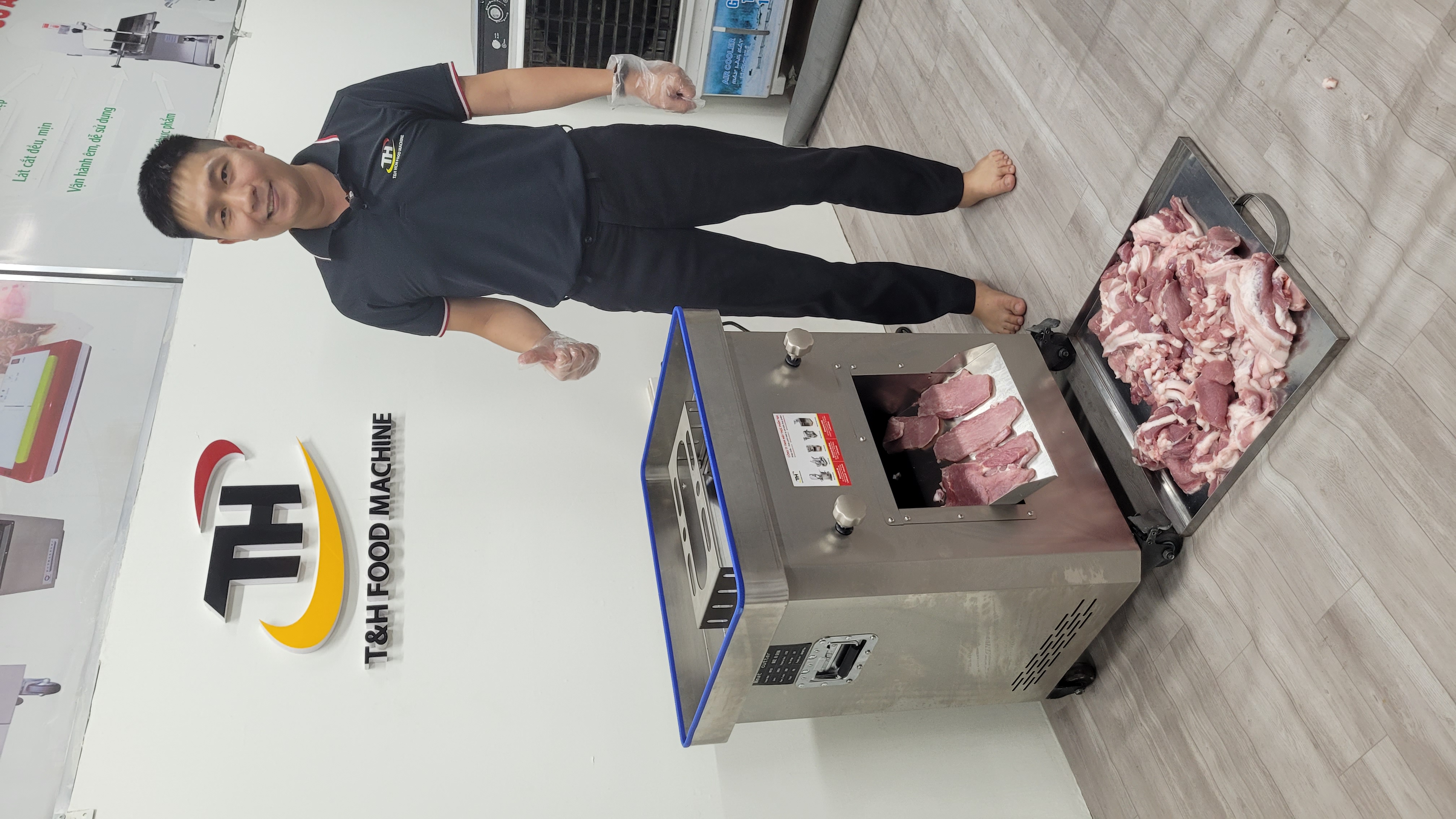Một sai lầm phổ biến của nhiều người mua máy thái thịt là dùng chung một bộ dao cho mọi loại thực phẩm. Tại buổi bàn giao ở Bắc Ninh, kỹ thuật viên T&H đã tư vấn rất kỹ cho anh khách về bộ dao chuyên dụng chặt xương.